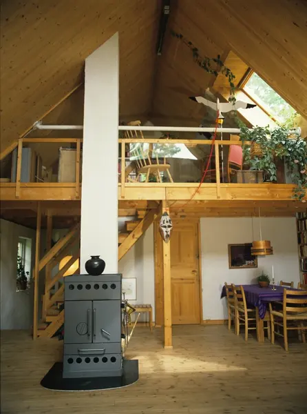 Hus på vestkanten i Oslo. Fra entreen kommer man inn i et trapperom med adgang til sokkeletasjen. Hovedplanet ligger en trapp opp. Her ser vi det åpne interiøret, gulvene er lagt med bord fra tippoldefars fjøs i Folldal. Illustrasjonsbilde fra Nye Bonytt 1988.