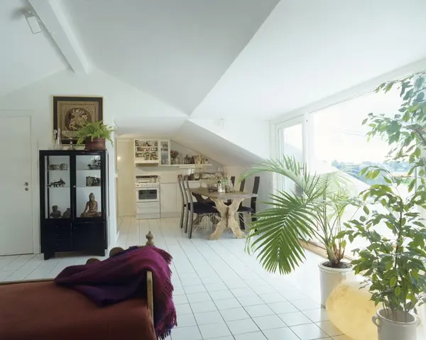 Blokkleilighet etter ombygging, åpen løsning mellom stuen og kjøkken. Illustrasjonsbilde fra Nye Bonytt 1989.