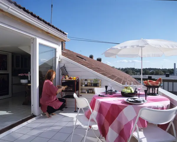 Blokkleilighet etter ombygging, stor terrasse. Illustrasjonsbilde fra Nye Bonytt 1989.