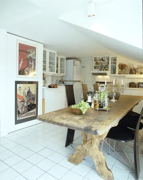 Blokkleilighet etter ombygging, kjøkkenet med gammelt kjøkkenbord. Illustrasjonsbilde fra Nye Bonytt 1989.