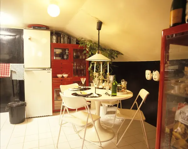 Blokkleilighet etter ombygging, kjøkkenet med sorte vegger og hvite fliser på gulvet. Illustrasjonsbilde fra Nye Bonytt 1989.