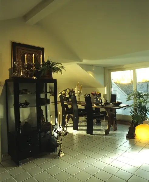 Blokkleilighet etter ombygging, kjøkkenet sett fra stuen. Illustrasjonsbilde fra Nye Bonytt 1989.
