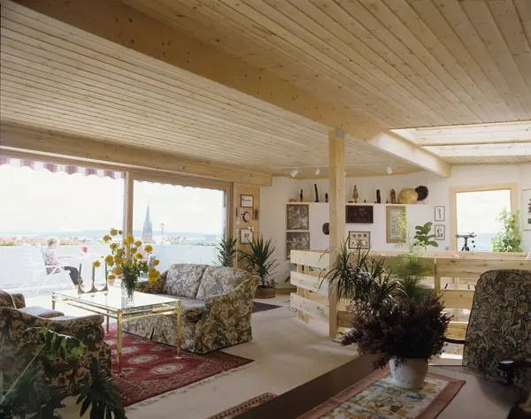 På toppen av bygård i Oslo, stuen i toppetasjen med utgang terrasse. Illustrasjonsbilde fra Nye Bonytt 1989.
