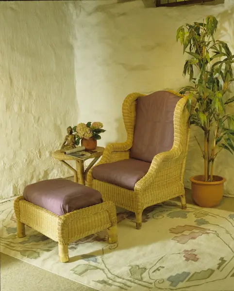 Kurvmøbler ute og inne, her ørelappstol med puff i peddig. Illustrasjonsbilde fra Nye Bonytt 1989.