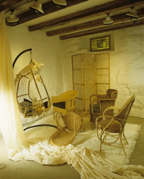 Kurvmøbler til bruk både ute og inne, ulike stoltyper, lette å flytte på. Illustrasjonsbilde fra Nye Bonytt 1989.
