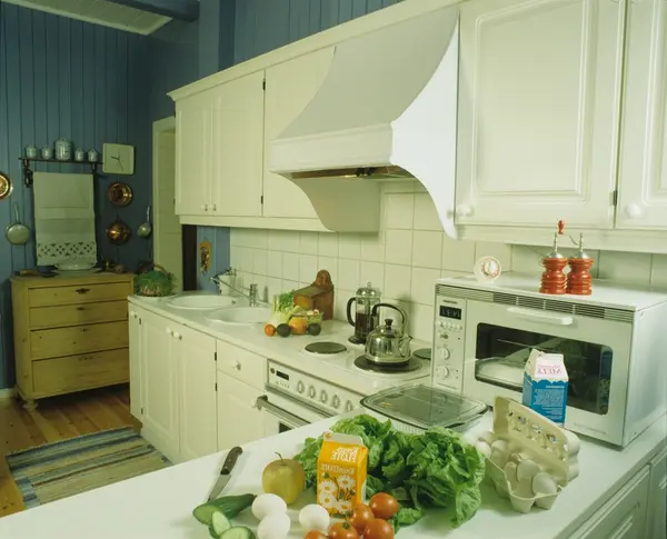 Ombygget kjøkken med frittstående arbeidsbenk. Illustrasjonsbilde fra Nye Bonytt 1989.