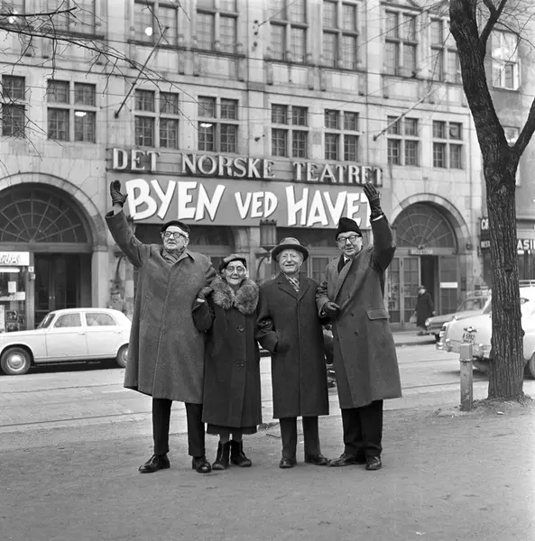 Det Norske Teatret feirer 50-års jubileum. Foran teatret står bl.a. Lars Tvinde, Edvard Drabløs og Henny Skjønberg. Fotografert desember 1962.