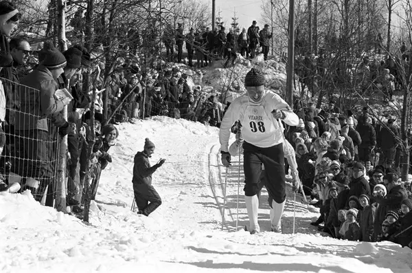 Skiløper Odd Martinsen, publikum står langs løypa, 50 km Holmenkollrennet 1969. Fotografert 15. mars 1969.