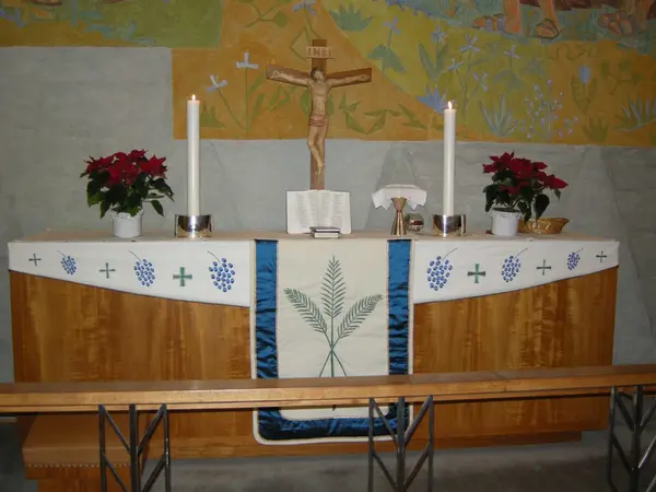 1. juledag i Tonsen kirke, Oslo. 25.12.2007. Alteret har fått nye tekstiler laget av tekstilkunstneren Anne Landsverk. Den hvite alterduken er utsmykket med blå druer og grønne greske kors. Den hvite midtløperen er utsmykket med grønne palmeblader (seierssymboler) og blå konturer som representerer himmelens farger. På alteret står det julestjerner, to tente lys, krusifiks og alterkalk.