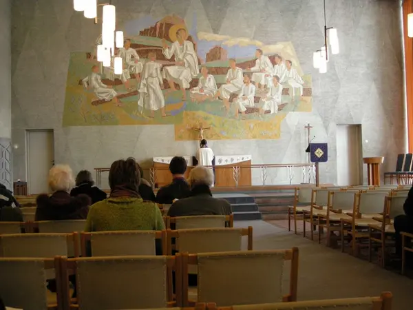 Langfredag i Tonsen kirke, 21.03.2008. Presten står med ryggen til oppe ved alteret som er ganske nakent. Kun dekket med hvit alterduk og et lilla klede. Krusifiks. Lesepulten har også et lilla klede. Veggmaleri.