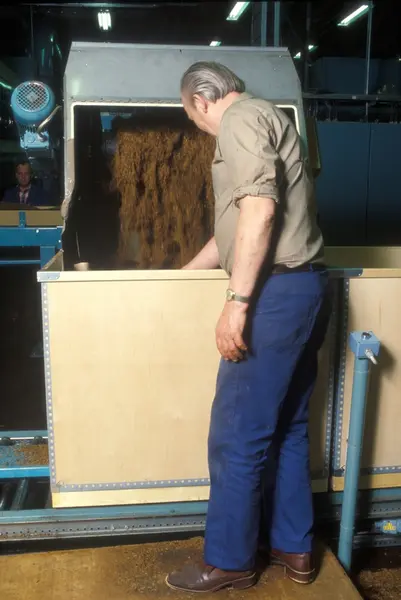 Ferdigprosessert røyketobakk fylles i kasser. Fabrikklokale. Tiedemanns Tobaksfabriks kursmateriell om tobakk.
