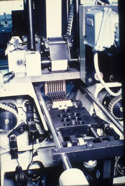 Veiemaskin røyketobakk, bakside på sjakten. Fabrikklokale. Tiedemanns Tobaksfabriks kursmateriell for maskinførerkurs, røyketobakk, pakkeavdelingen.