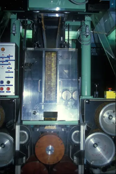 Veiemaskin. Fabrikklokale. Tiedemanns Tobaksfabriks kursmateriell for maskinførerkurs, røyketobakk, pakkeavdelingen.