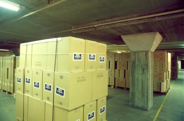 Emballasjelageret hos Tiedemanns Tobaksfabrik..