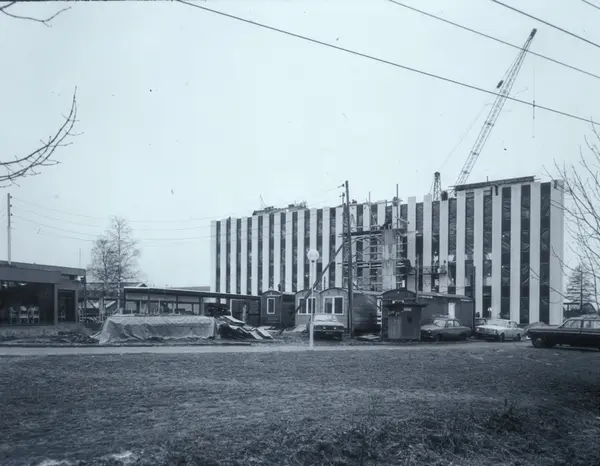 Byggeplass. Konstruksjon av Tiedemanns Tobaksfabrik på Hovin.