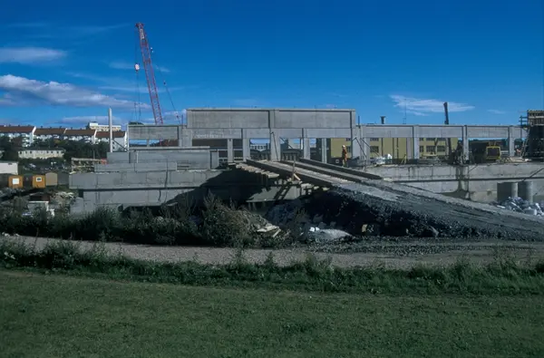 Byggeplass. Konstruksjon av Tiedemanns nye råtobakklager på Hovin i 1978.