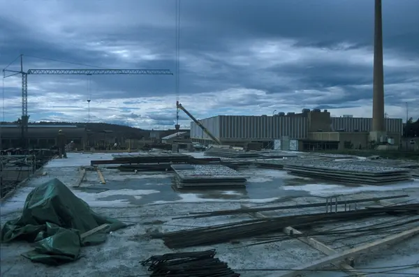 Byggeplass. Konstruksjon av Tiedemanns nye råtobakklager på Hovin i 1978.