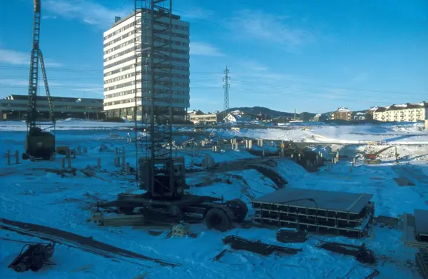 Byggeplass. Konstruksjon av Tiedemanns nye råtobakklager på Hovin i 1978.