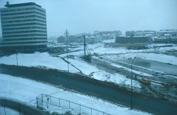Byggeplass. Konstruksjon av Tiedemanns nye råtobakklager på Hovin i 1978.