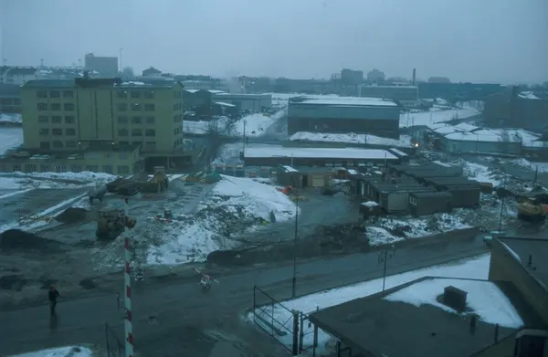 Byggeplass. Konstruksjon av Tiedemanns nye råtobakklager på Hovin i 1978.