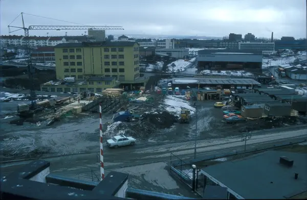 Byggeplass. Konstruksjon av Tiedemanns nye råtobakklager på Hovin i 1978.