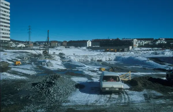 Byggeplass. Konstruksjon av Tiedemanns nye råtobakklager på Hovin i 1978.