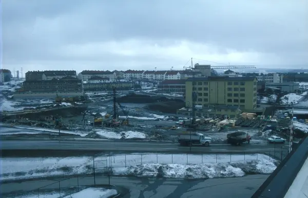 Byggeplass. Konstruksjon av Tiedemanns nye råtobakklager på Hovin i 1978.