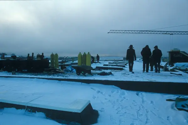 Byggeplass. Konstruksjon av Tiedemanns nye råtobakklager på Hovin i 1978.