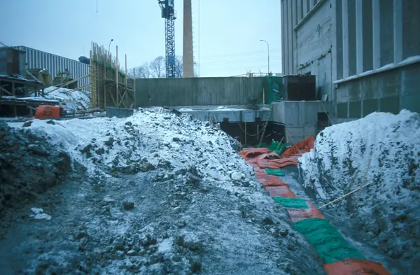 Byggeplass. Konstruksjon av Tiedemanns nye råtobakklager på Hovin i 1978.