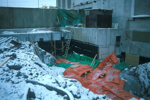 Byggeplass. Konstruksjon av Tiedemanns nye råtobakklager på Hovin i 1978.
