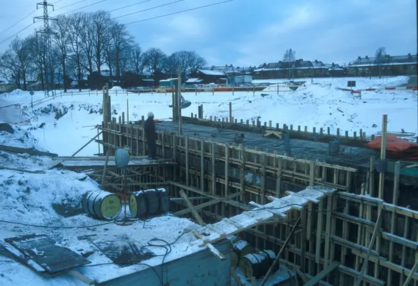 Byggeplass. Konstruksjon av Tiedemanns Tobaksfabrik på Hovin.