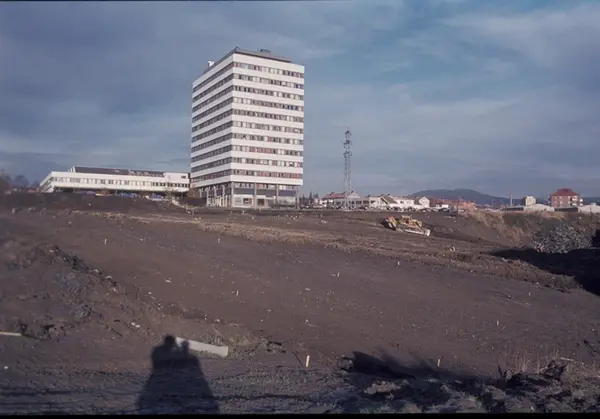 Byggeplass. Konstruksjon av Tiedemanns nye råtobakklager på Hovin i 1978.
