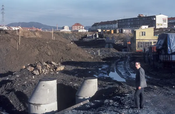 Byggeplass. Konstruksjon av Tiedemanns nye råtobakklager på Hovin i 1978.