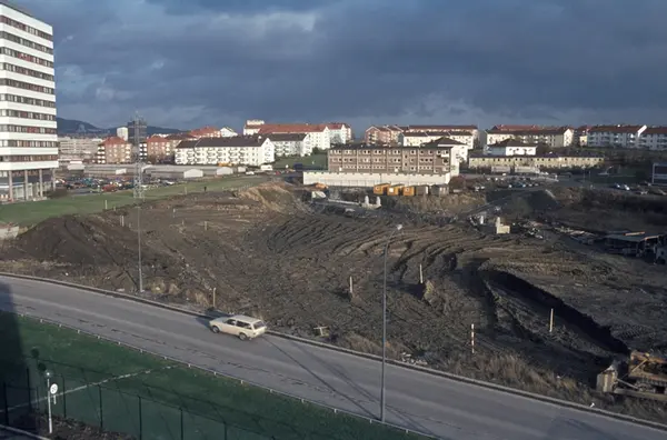 Byggeplass. Konstruksjon av Tiedemanns nye råtobakklager på Hovin i 1978.