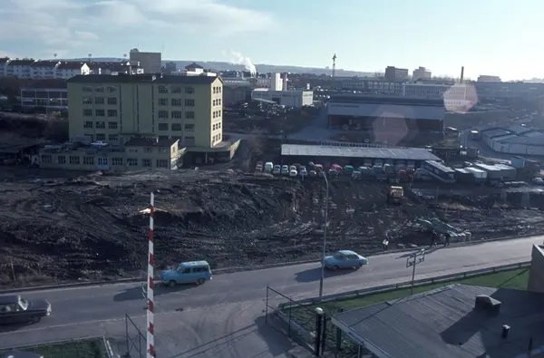 Byggeplass. Konstruksjon av Tiedemanns nye råtobakklager på Hovin i 1978.