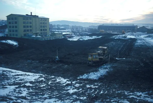 Byggeplass. Konstruksjon av Tiedemanns nye råtobakklager på Hovin i 1978.