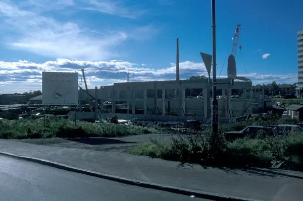 Byggeplass. Konstruksjon av Tiedemanns nye råtobakklager på Hovin i 1978.
