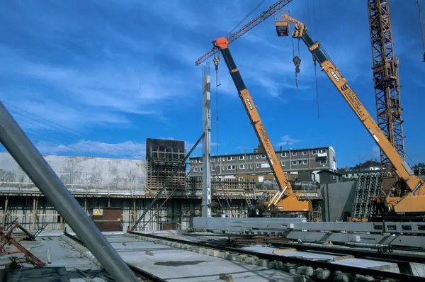 Byggeplass. Konstruksjon av Tiedemanns nye råtobakklager på Hovin i 1978.