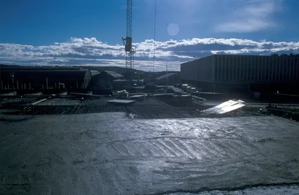 Byggeplass. Konstruksjon av Tiedemanns nye råtobakklager på Hovin i 1978.