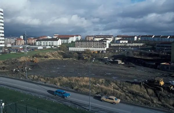 Byggeplass. Konstruksjon av Tiedemanns nye råtobakklager på Hovin i 1978.