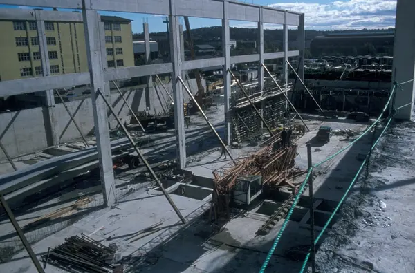 Byggeplass. Konstruksjon av Tiedemanns nye råtobakklager på Hovin i 1978.