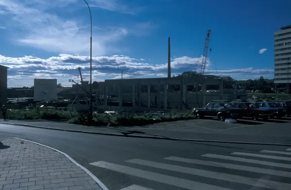 Byggeplass. Konstruksjon av Tiedemanns nye råtobakklager på Hovin i 1978.