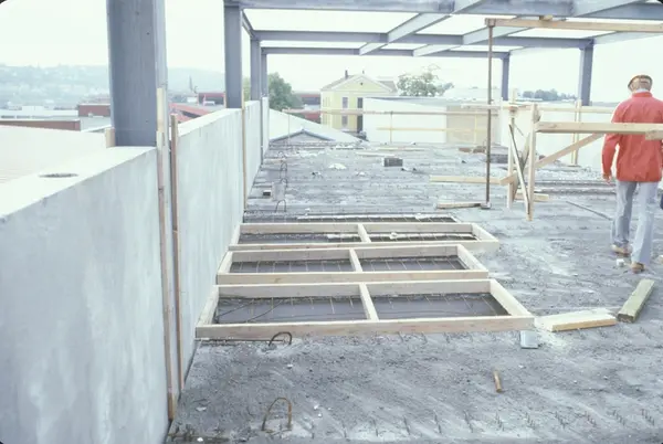 Byggeplass. Utvidelse av Tiedemanns fabrikk på Hovin i 1982-83.