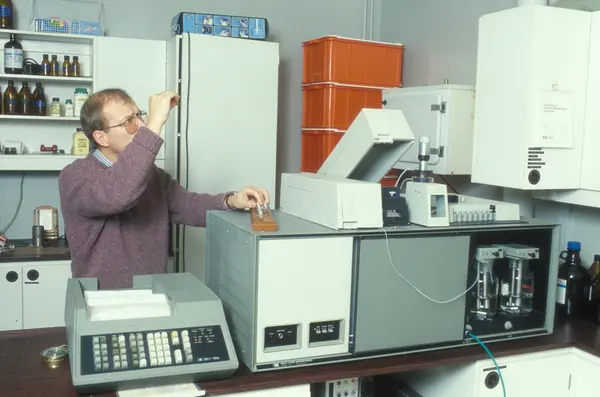 Laboratorium. Produksjon på Tiedemanns Tobaksfabrik.