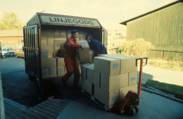 Flytting av esker til lastebil. Emballasjelager, Gladengveien, skur nr. 3. Tiedemanns Tobaksfabrik.