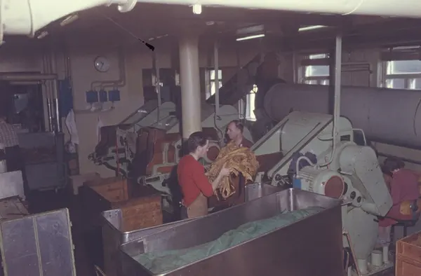 Giljotinskjærmaskin hos Tiedemanns Tobaksfabrik.