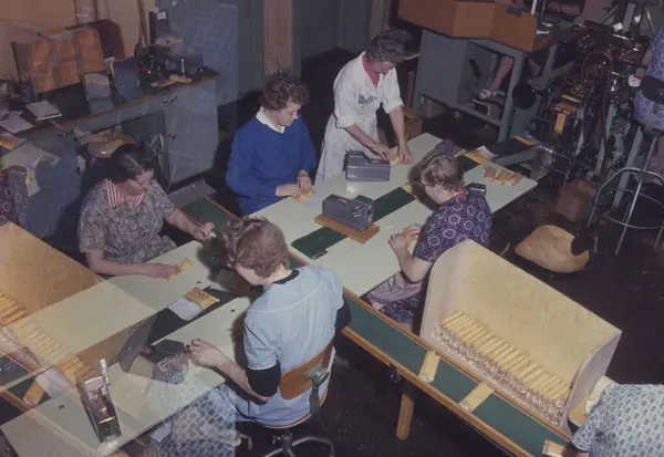 Pakking for hånd av Tiedemanns gul røyketobakk hos Tiedemanns Tobaksfabrik.