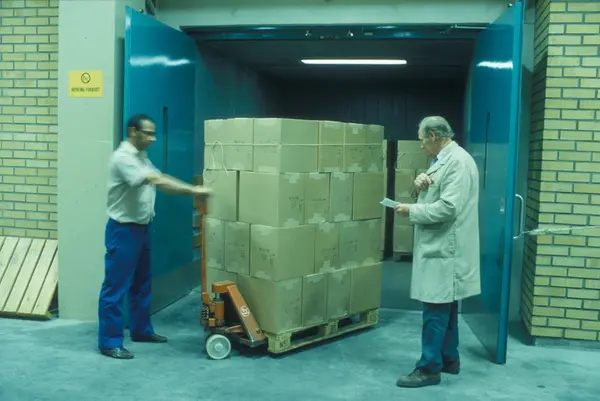 Pall med esker. Lager og transport hos Tiedemanns Tobaksfabrik.