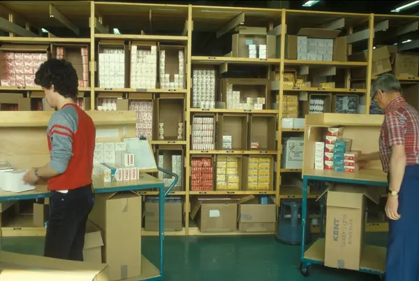Lager med tobakk og sigaretter. Lager og transport hos Tiedemanns Tobaksfabrik.