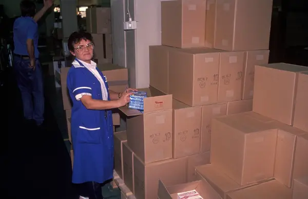 Fabrikkinteriør. Pakking i esker. Produksjon av tobakk hos Tiedemanns Tobaksfabrik.